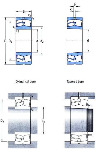 Spherical Roller Bearings: These bearings have two rows of barrel shaped (spherical) rollers which run on a common spherical outer and inner raceway, they are inclined at an angle to the bearings axis. Their design offers many features such as self alignment, insensitivity to misalignment, tolerance to heavy radial and axial loads etc. They are manufactured with in both parallel and tapered bore variants. Benefits: High radial and axial loads, misalignment, taper and parallel bore options |