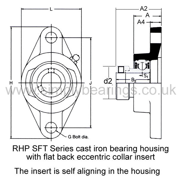 RHP SFT EC Series 2 Bolt Oval Cast Iron Housing Units: Two bolt oval cast iron bearing unit supplied with a sealed flat back bearing insert fitted and includes a grease nipple to facilitate re-lubrication. The bearing insert has an eccentric collar and grub screw to allow tightening against the shaft after installation. |